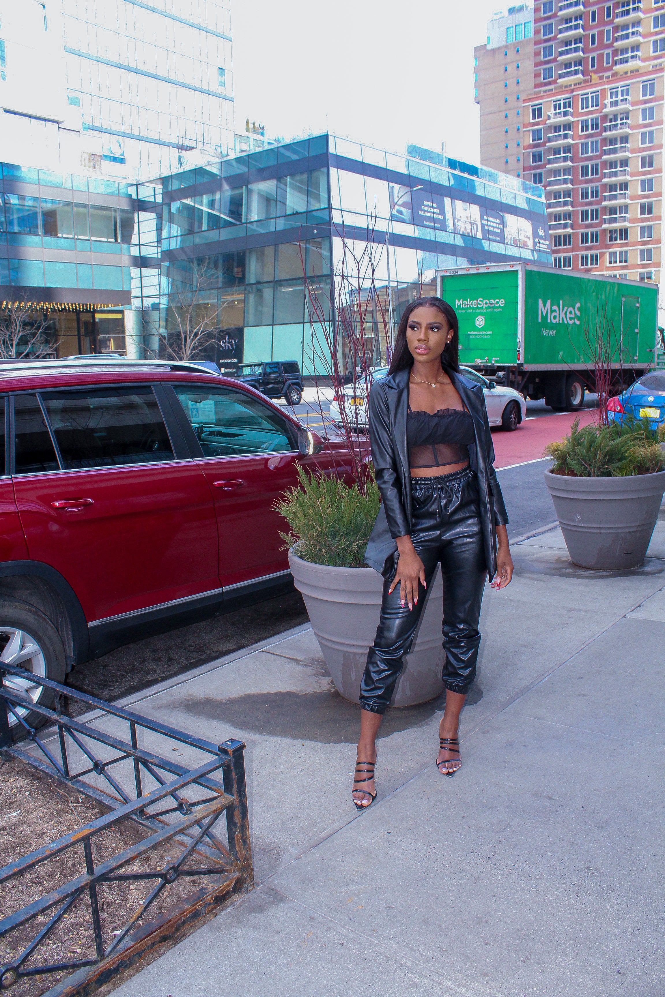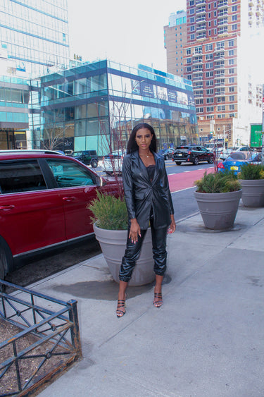 Leather Long Sleeve Blazer with a button. This is a sophisticated piece that can dressed up or down a outfit.